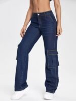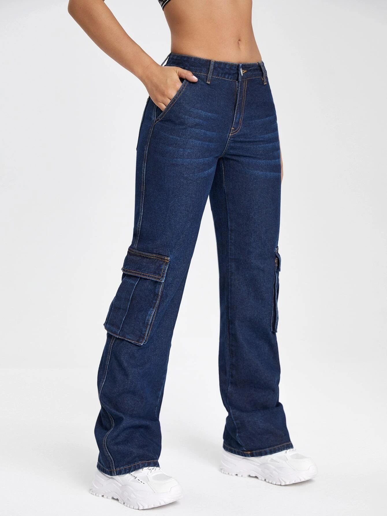 Women Blues Flap Pocket Cargo Jeans